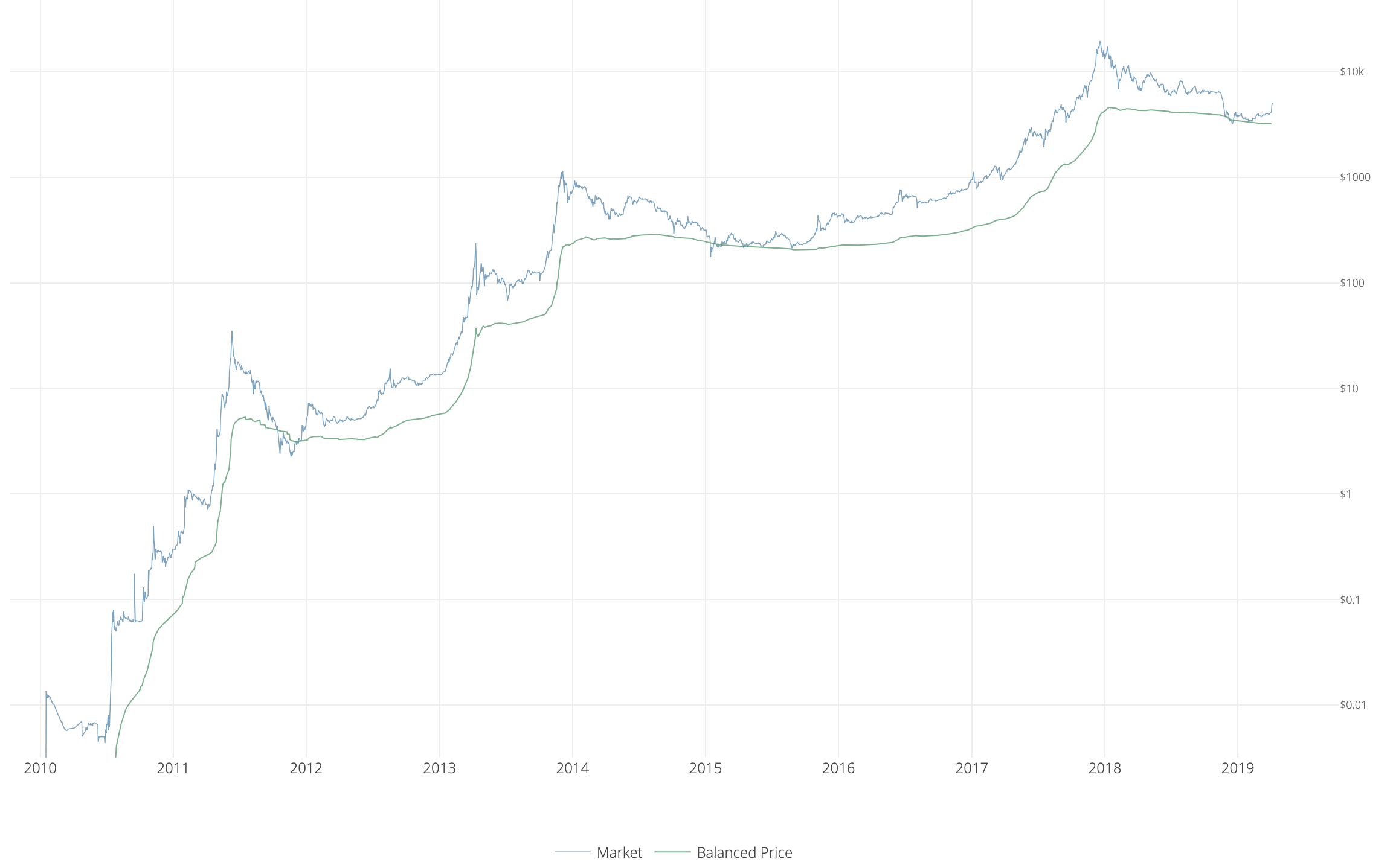 `bb"TransferredPrice"_(USD)=(sum(bb"coindays destroyed" * price)) / (days * bb"supply")`Looking at this as a life-to-date moving average of spending behavior (again, old hands selling into new hands), it can be assumed that when subtracted from realized price (the average paid for all coins in the market), a “fair” valuation measure emerges. Balanced price denotes the level at which, during bear markets, a full detox has been achieved — market price matching what was paid minus what was spent.